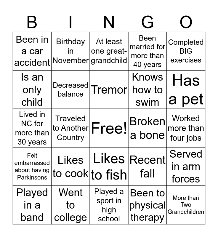 This bingo card has a free space and 36 words: Parkinson's Disease, Take Carbidopa/Levadopa, Uses an active device for walking, Decreased balance, Recent fall, Felt embarrassed about having Parkinsons, Tremor, Been to Rock Steady Boxing, Completed BIG exercises, Has an iPhone, Traveled to Another Country, Been married for more than 40 years, Likes sports, Broken a bone, Has a pet, Been in a car accident, Lived in another state, Likes to cook, More than Two Grandchildren, At least one great-grandchild, Worked more than four jobs, Served in arm forces, Went to college, Played in a band, Played a sport in high school, Birthday in November, Lived in NC for more than 30 years, Afraid of flying, Knows how to swim, Is an only child, Has more than five siblings, Been to a professional sporting event, Been to physical therapy, Likes to fish, Blue Eyes and Born in Gaston County.