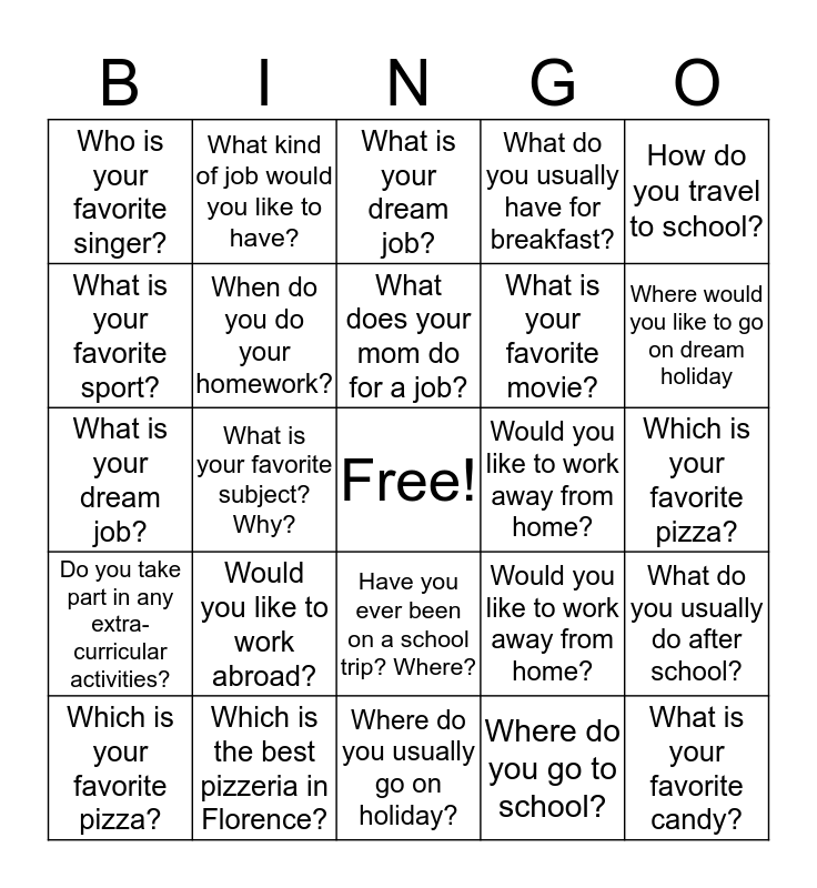 This bingo card has a free space and 32 words: Where do you go to school?, Do you like school?, What is your favorite subject? Why?, What subject do you like the least? Why?, Do you take part in any extra-curricular activities?, When do you do your homework?, How do you travel to school?, What do you usually do after school?, What kind of job would you like to have?, Where does your dad work?, What does your mom do for a job?, What is your dream job?, Have you ever been on a school trip? Where?, Would you like to work abroad?, Would you like to work away from home?, What is the best Italian food?, Which is your favorite pizza?, What is your dream job?, Have you ever been on a school trip? Where?, Would you like to work abroad?, Would you like to work away from home?, What is the best Italian food?, Which is your favorite pizza?, Which is the best pizzeria in Florence?, What is your favorite candy?, What do you usually have for breakfast?, What is your favorite movie?, What is your favorite sport?, Who is your favorite singer?, Where do you usually go on holiday?, Are you going on holiday this year? and Where would you like to go on dream holiday.