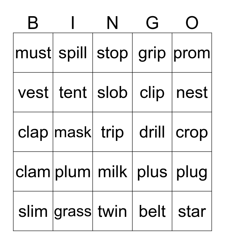 This bingo card has a free space and 24 words: plum, grass, slob, slim, prom, must, vest, spill, drill, milk, clip, clap, plus, plug, tent, belt, crop, stop, nest, mask, star, clam, grip and twin.