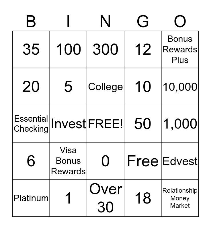 This bingo card has a free space and 24 words: Visa Bonus Rewards, 1, College, Platinum, Bonus Rewards Plus, 35, 20, 100, 50, 0, 10, Essential Checking, Free, Edvest, 5, 18, 1,000, 300, 10,000, Invest, Relationship Money Market, 6, 12 and Over 30.