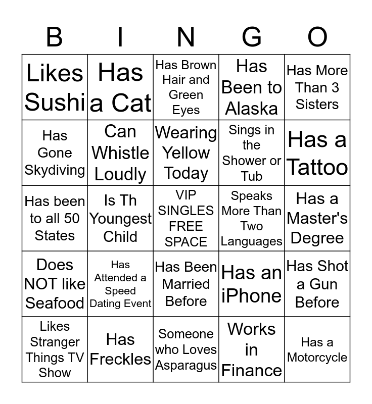 This bingo card has a free space and 24 words: Has Attended a Speed Dating Event, Has Freckles, Wearing Yellow Today, Likes Stranger Things TV Show, Has More Than 3 Sisters, Likes Sushi, Has Gone Skydiving, Has a Cat, Speaks More Than Two Languages, Has Been Married Before, Sings in the Shower or Tub, Has been to all 50 States, Has an iPhone, Has Shot a Gun Before, Can Whistle Loudly, Works in Finance, Has a Master's Degree, Has Brown Hair and Green Eyes, Has a Tattoo, Is Th Youngest Child, Has a Motorcycle, Does NOT like Seafood, Has Been to Alaska and Someone who Loves Asparagus.