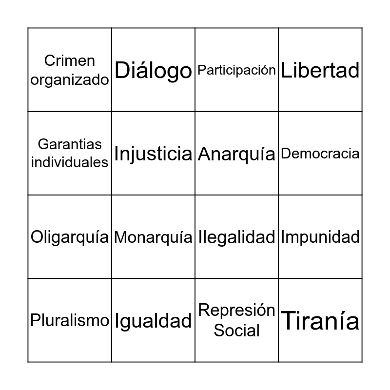 This bingo card has 16 words: Pluralismo, Igualdad, Participación, Libertad, Garantias individuales, Diálogo, Ilegalidad, Impunidad, Crimen organizado, Injusticia, Represión Social, Democracia, Oligarquía, Monarquía, Anarquía and Tiranía.