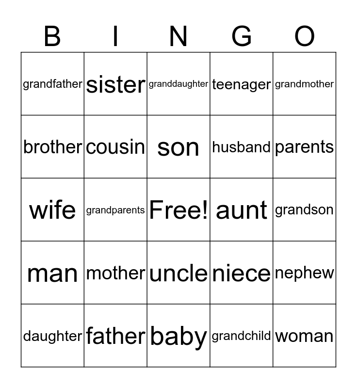This bingo card has a free space and 24 words: mother, father, son, daughter, grandmother, grandfather, brother, sister, aunt, uncle, husband, wife, niece, nephew, cousin, grandchild, grandson, granddaughter, parents, grandparents, woman, man, teenager and baby.