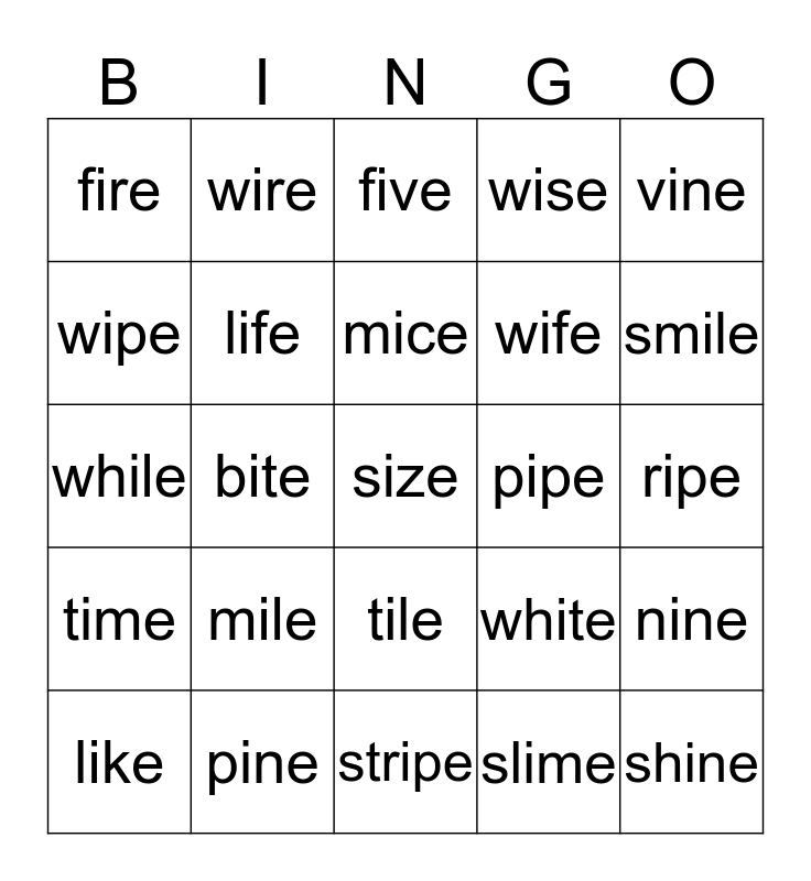 This bingo card has a free space and 29 words: like, mike, bite, file, fire, five, life, mile, pipe, pine, ripe, shine, stripe, slime, smile, swipe, tile, time, vine, while, white, wide, wife, wipe, wise, wire, nine, mice and mine.