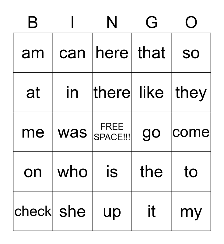 This bingo card has a free space and 24 words: who, she, there, check, so, am, at, can, go, is, like, me, the, to, in, it, come, here, they, was, my, on, that and up.