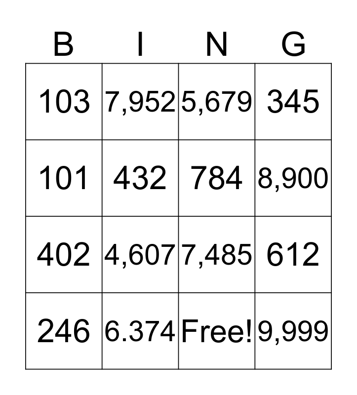 This bingo card has 17 words: Free!, 246, 5,679, 103, 4,607, 345, 612, 784, 8,900, 432, 6.374, 7,485, 101, 7,952, 402, 567 and 9,999.