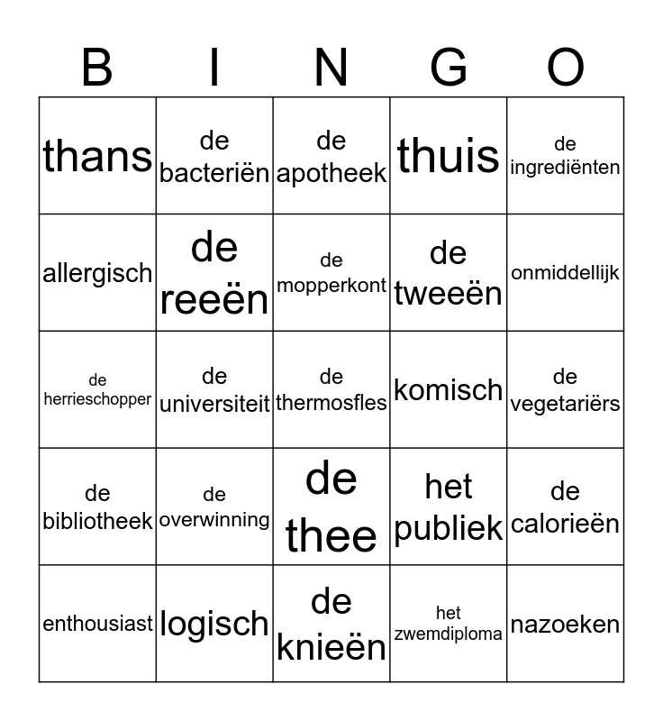 This bingo card has 25 words: de overwinning, de knieën, de mopperkont, enthousiast, de ingrediënten, thans, allergisch, de bacteriën, komisch, de thee, de tweeën, de herrieschopper, het publiek, de calorieën, de reeën, nazoeken, de vegetariërs, de apotheek, onmiddellijk, de universiteit, de thermosfles, logisch, de bibliotheek, thuis and het zwemdiploma.