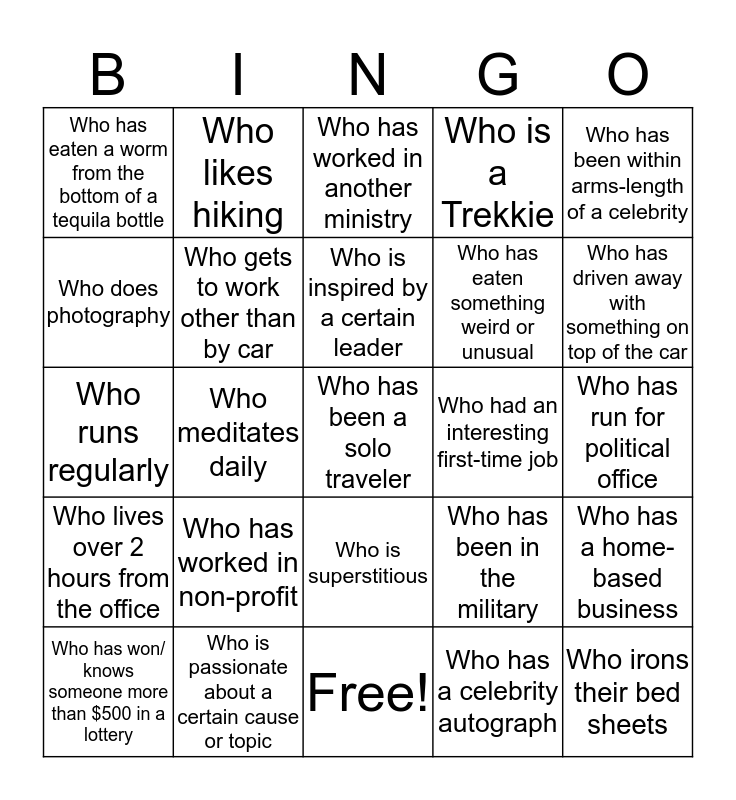 This bingo card has 26 words: Who lives over 2 hours from the office, Who is passionate about a certain cause or topic, Who is inspired by a certain leader, Who has a celebrity autograph, Who has been within arms-length of a celebrity, Who has eaten a worm from the bottom of a tequila bottle, Who gets to work other than by car, Who has worked in another ministry, Who has eaten something weird or unusual, Who irons their bed sheets, Who does photography, Who meditates daily, Free!, Who has been in the military, Who has run for political office, Who has won/ knows someone more than $500 in a lottery, Who likes hiking, Who is superstitious, Who is a Trekkie, Who has a home-based business, Who runs regularly, Who has worked in non-profit, Who has been a solo traveler, Who had an interesting first-time job, Who has driven away with something on top of the car and Who has gone mountain climbing.