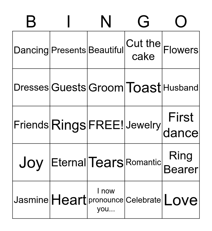 This bingo card has a free space and 78 words: 'Til death do us part!, Bachelor Party, Beautiful, Best Wishes!, Bouquet, Bride, Bubbles, Camera, Caterer, Ceremony, Certificate, Champagne, Cut the cake, Dancing, Diamond Ring, Dresses, Engagement, Eternal, Family, First dance, Flower girl, Flowers, Friends, Groom, Guests, Hand holding, Happily ever after, Happiness, Honey Moon, Hugs, Husband, I do!, I now pronounce you..., Invitation, Jasmine, Jewelry, Kiss, Kiss the bride, Laughter, Love, Maid of Honor, Marriage, Matt, Music, Photographer, Presents, Proposal, Reception, Registry, Residence Life, Ring Bearer, Rings, Romantic, Shoes, Something blue, Something borrowed, Something new, Something old, Suit and Tie, Tears, Toast, Together Forever!, Vail, Wedding Cake, Wedding Day, Wedding Gift, Wine & Cheese, You're next!, Joy, Heart, Always, RSVP, Invitation, Elegant, Celebrate, Gown, Just Married and Trus.