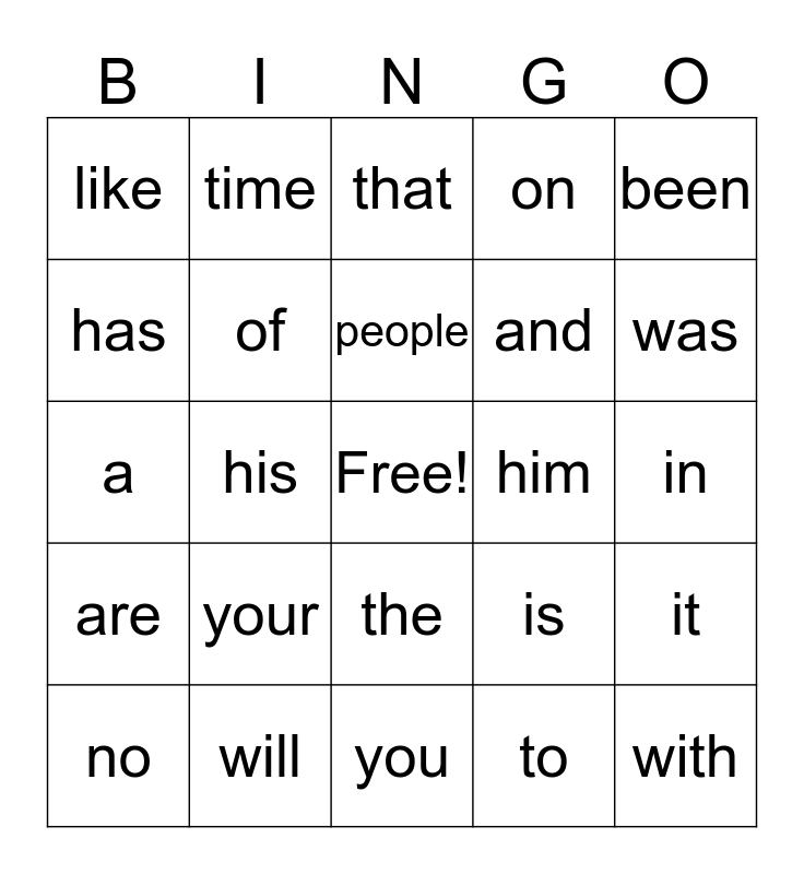 This bingo card has a free space and 24 words: your, will, people, no, been, like, has, time, him, the, and, a, is, it, of, to, in, that, was, his, with, are, on and you.