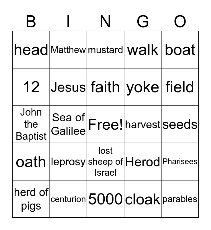 This bingo card has a free space and 24 words: leprosy, centurion, faith, herd of pigs, boat, head, 12, Matthew, harvest, lost sheep of Israel, yoke, John the Baptist, Herod, Pharisees, Jesus, cloak, seeds, mustard, field, Sea of Galilee, parables, oath, walk and 5000.