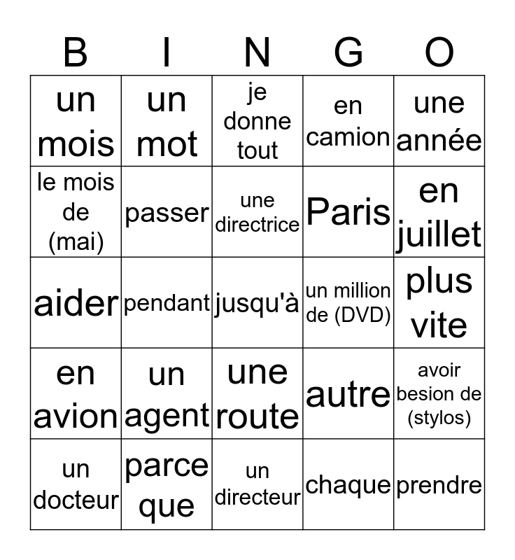 This bingo card has 25 words: un agent, un directeur, une directrice, un docteur, une année, un mois, le mois de (mai), un mot, un million de (DVD), une route, Paris, aider, autre, avoir besion de (stylos), passer, prendre, plus vite, je donne tout, en juillet, pendant, jusqu'à, parce que, en avion, en camion and chaque.