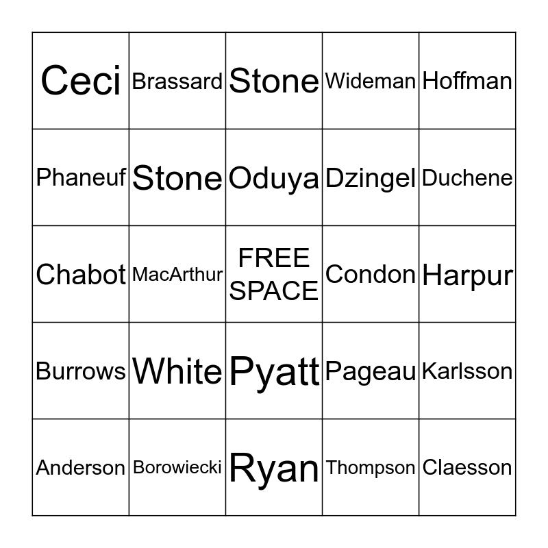 This bingo card has a free space and 24 words: White, Borowiecki, Oduya, Anderson, Hoffman, Ceci, Phaneuf, Brassard, Condon, Pyatt, Dzingel, Chabot, Pageau, Karlsson, Stone, Thompson, Harpur, Stone, Duchene, MacArthur, Claesson, Burrows, Wideman and Ryan.