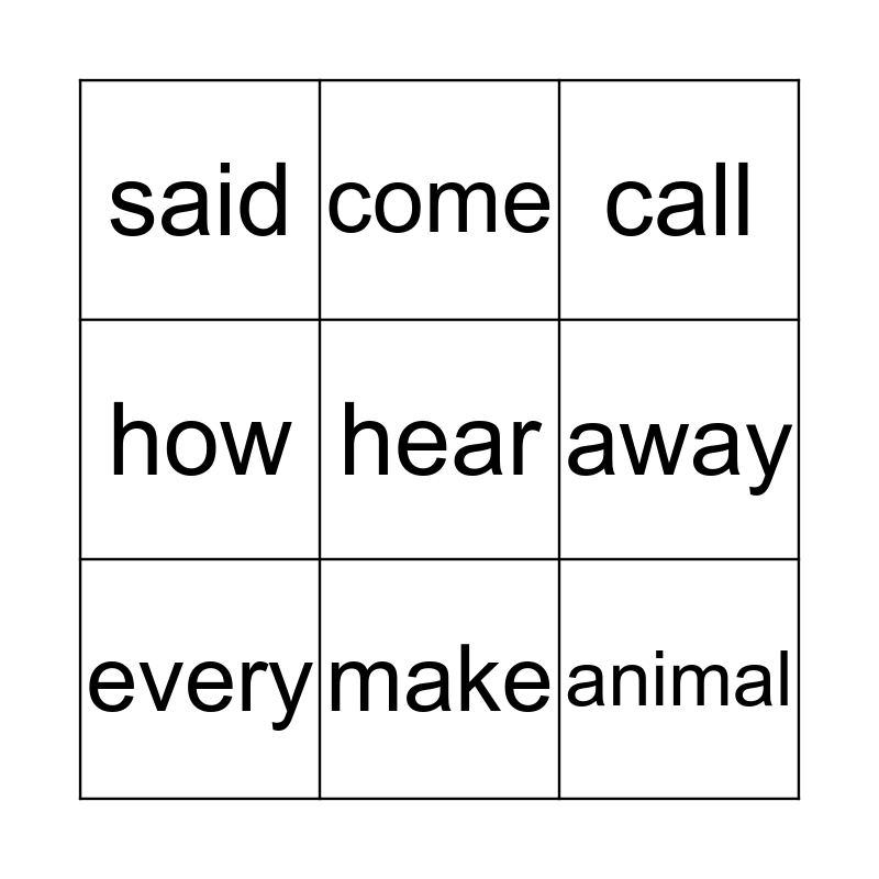 This bingo card has a free space and 8 words: away, call, come, every, said, animal, how and make.
