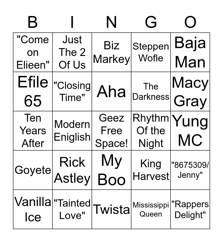 This bingo card has a free space and 24 words: Rick Astley, "Tainted Love", Aha, Vanilla Ice, Baja Man, "Come on Elieen", Efile 65, Just The 2 Of Us, Rhythm Of the Night, My Boo, The Darkness, Ten Years After, King Harvest, "8675309/ Jenny", "Closing Time", Mississippi Queen, Yung MC, Biz Markey, Macy Gray, Modern Eniglish, "Rappers Delight", Goyete, Steppen Wofle and Twista.