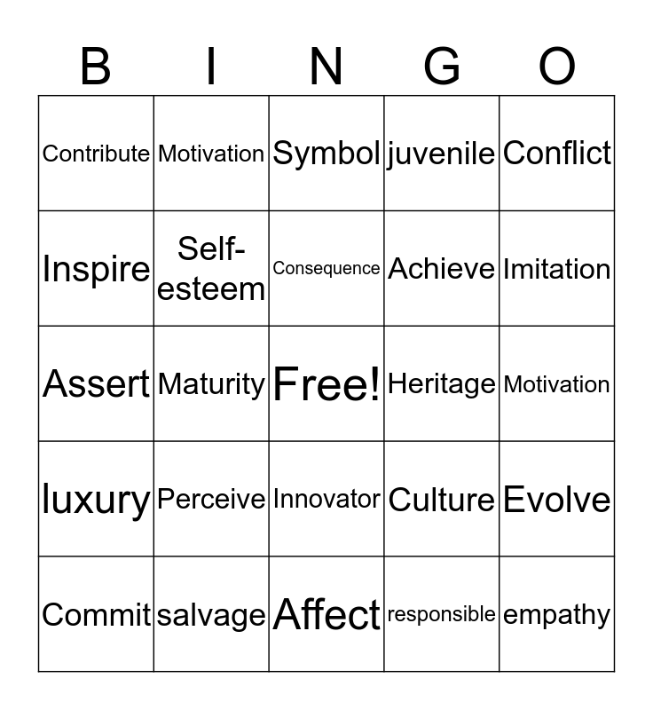 This bingo card has a free space and 25 words: Perceive, Affect, Consequence, Commit, Conflict, Contribute, Inspire, Motivation, Heritage, Innovator, Achieve, Assert, Culture, Evolve, Self-esteem, perspective, Motivation, Symbol, Imitation, Maturity, empathy, salvage, luxury, juvenile and responsible.