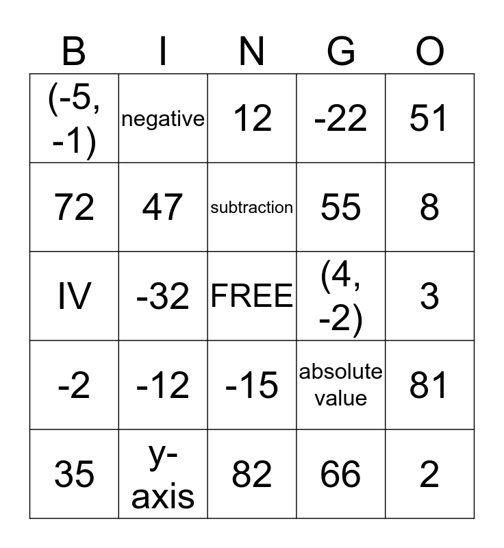 This bingo card has a free space and 24 words: -12, y-axis, subtraction, 35, 51, (-5, -1), 72, negative, (4, -2), -15, 55, IV, absolute value, 81, 47, 66, 3, 12, 8, -32, 2, -2, -22 and 82.