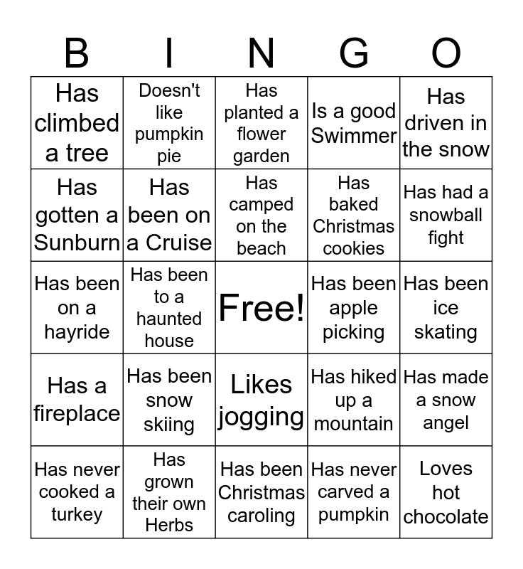 This bingo card has a free space and 24 words: Has been snow skiing, Has grown their own Herbs, Has camped on the beach, Has never cooked a turkey, Has driven in the snow, Has climbed a tree, Has gotten a Sunburn, Doesn't like pumpkin pie, Has been apple picking, Likes jogging, Has baked Christmas cookies, Has been on a hayride, Has hiked up a mountain, Has made a snow angel, Has been on a Cruise, Has never carved a pumpkin, Has been ice skating, Has planted a flower garden, Has had a snowball fight, Has been to a haunted house, Loves hot chocolate, Has a fireplace, Is a good Swimmer and Has been Christmas caroling.