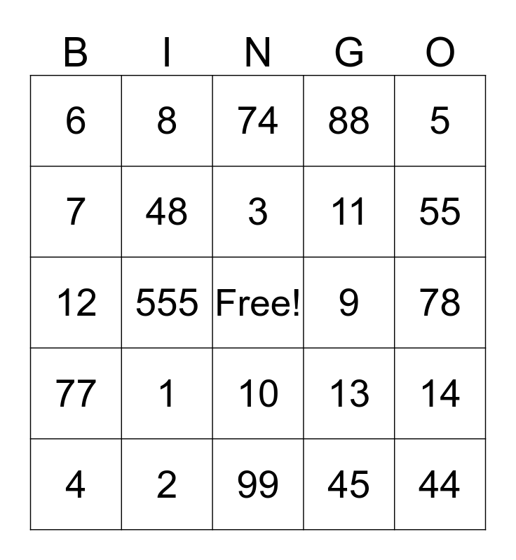 This bingo card has a free space and 24 words: 1, 2, 3, 4, 5, 6, 7, 8, 9, 10, 11, 12, 13, 14, 48, 45, 78, 74, 55, 555, 44, 77, 88 and 99.