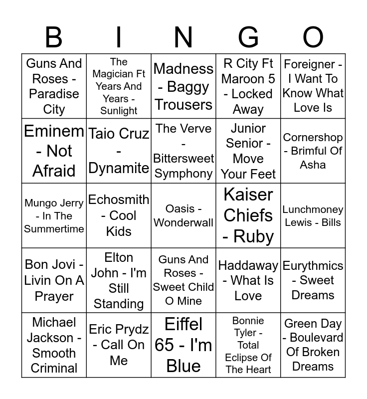 This bingo card has a free space and 24 words: Elton John - I'm Still Standing, Eric Prydz - Call On Me, The Verve - Bittersweet Symphony, Michael Jackson - Smooth Criminal, Foreigner - I Want To Know What Love Is, Guns And Roses - Paradise City, Eminem - Not Afraid, The Magician Ft Years And Years - Sunlight, Kaiser Chiefs - Ruby, Guns And Roses - Sweet Child O Mine, Junior Senior - Move Your Feet, Mungo Jerry - In The Summertime, Haddaway - What Is Love, Eurythmics - Sweet Dreams, Taio Cruz - Dynamite, Bonnie Tyler - Total Eclipse Of The Heart, Lunchmoney Lewis - Bills, Madness - Baggy Trousers, Cornershop - Brimful Of Asha, Echosmith - Cool Kids, Green Day - Boulevard Of Broken Dreams, Bon Jovi - Livin On A Prayer, R City Ft Maroon 5 - Locked Away and Eiffel 65 - I'm Blue.