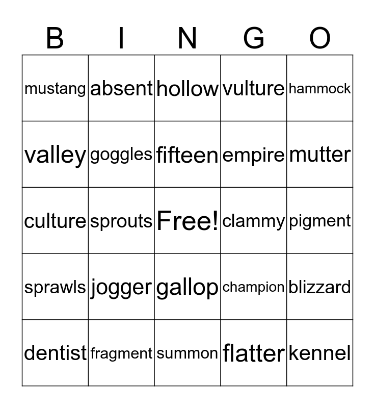 This bingo card has a free space and 25 words: dentist, jogger, fifteen, flatter, mutter, mustang, absent, hollow, empire, blizzard, culture, goggles, champion, kennel, valley, fragment, summon, vulture, pigment, sprawls, sprouts, gallop, clammy, hammock and mouthful.