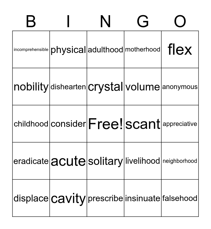 This bingo card has a free space and 24 words: acute, cavity, crystal, displace, flex, incomprehensible, nobility, physical, scant, solitary, volume, childhood, livelihood, neighborhood, dishearten, insinuate, appreciative, adulthood, anonymous, consider, falsehood, eradicate, motherhood and prescribe.
