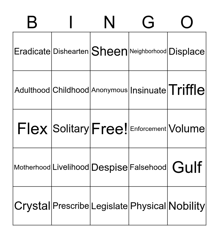 This bingo card has a free space and 24 words: Livelihood, Prescribe, Anonymous, Crystal, Displace, Eradicate, Adulthood, Dishearten, Enforcement, Despise, Insinuate, Flex, Falsehood, Gulf, Childhood, Physical, Volume, Sheen, Triffle, Solitary, Nobility, Motherhood, Neighborhood and Legislate.
