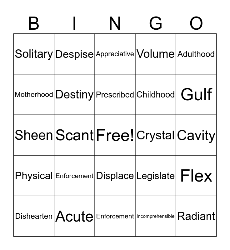 This bingo card has a free space and 24 words: Enforcement, Acute, Prescribed, Dishearten, Adulthood, Solitary, Motherhood, Despise, Crystal, Displace, Childhood, Sheen, Legislate, Flex, Destiny, Incomprehensible, Cavity, Appreciative, Gulf, Scant, Radiant, Physical, Volume and Enforcement.