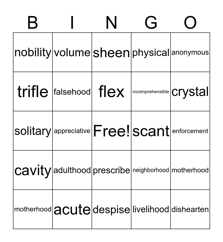 This bingo card has a free space and 24 words: adulthood, acute, flex, motherhood, anonymous, nobility, trifle, volume, scant, prescribe, incomprehensible, solitary, neighborhood, motherhood, falsehood, livelihood, enforcement, sheen, crystal, appreciative, dishearten, cavity, physical and despise.