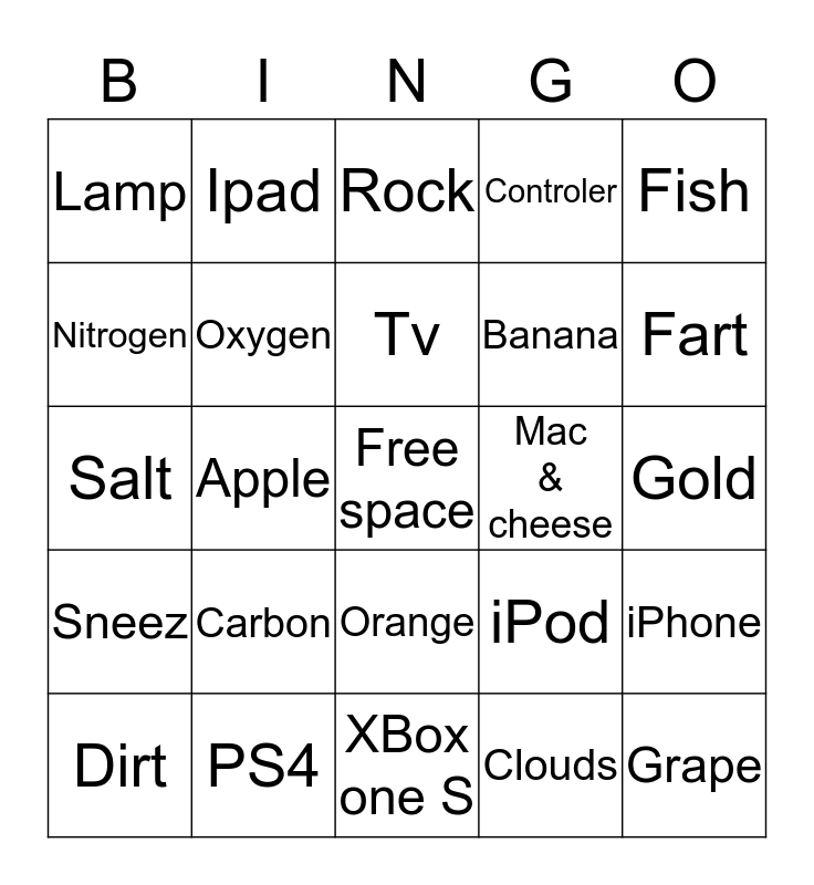 This bingo card has a free space and 24 words: Dirt, Carbon, Tv, Clouds, Fish, Lamp, Ipad, Rock, Mac & cheese, Gold, Salt, Oxygen, iPod, iPhone, Nitrogen, PS4, XBox one S, Controler, Fart, Sneez, Apple, Orange, Banana and Grape.