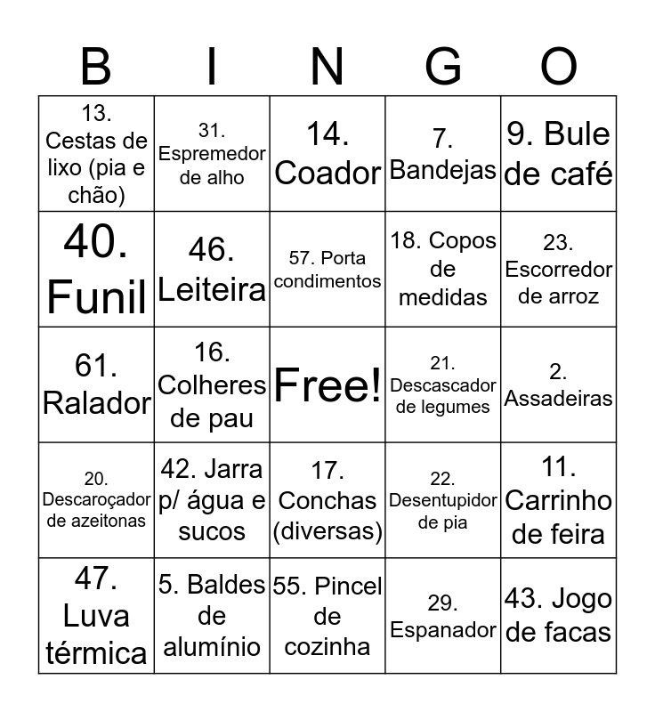 This bingo card has a free space and 70 words: 1. Açucareiro, 2. Assadeiras, 3. Avental, 4. Bacias de plástico, 5. Baldes de alumínio, 6. Baldes de plástico, 7. Bandejas, 8. Batedor de ovos, 9. Bule de café, 10. Cafeteira de vidro, 11. Carrinho de feira, 12. Cesta p/ pão, 13. Cestas de lixo (pia e chão), 14. Coador, 15. Cobridores de alimento, 16. Colheres de pau, 17. Conchas (diversas), 18. Copos de medidas, 19. Descanso de panelas, 20. Descaroçador de azeitonas, 21. Descascador de legumes, 22. Desentupidor de pia, 23. Escorredor de arroz, 24. Escorredor de louça, 25. Escorredor de macarrão, 26. Escova para migalhas, 27. Escova para pia, 28. Espagueteira, 29. Espanador, 30. Espátula / faca para queijo, 31. Espremedor de alho, 32. Espremedor de batatas, 33. Espremedor de laranja, 34. Faca de pão, 35. Forma de pizza, 36. Forma para bolos, 37. Forma para microondas, 38. Forma para tortas, 39. Frigideira, 40. Funil, 41. Garrafa plástica e térmica, 42. Jarra p/ água e sucos, 43. Jogo de facas, 44. Jogo de pirex, 45. Lava-copos, 46. Leiteira, 47. Luva térmica, 48. Pá de lixo, 49. Paliteiro, 50. Panos de prato, 51. Pegador de gelo, 52. Pegador de panelas, 53. Peneiras, 54. Pilão de temperos, 55. Pincel de cozinha, 56. Plásticos p/ freezer, 57. Porta condimentos, 58. Potes (diversos), 59. Prendedor de roupas, 60. Quebra-nozes, 61. Ralador, 62. Relógio de cozinha, 63. Rodo de pia, 64. Rolo de macarrão, 65. Saleiro, 66. Suporte para papel toalha, 67. Tábua de carne, 68. Talheres para salada, 69. Tesoura para cozinha and 70. Utensílios de silicone.