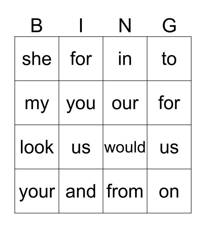 This bingo card has 16 words: and, us, in, she, look, for, would, from, my, you, your, to, us, for, our and on.