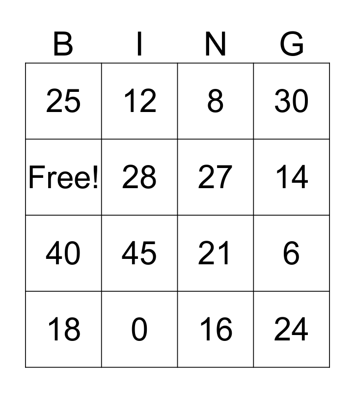 This bingo card has 16 words: 0, 6, 8, 25, 40, 12, 21, 16, Free!, 28, 18, 30, 45, 14, 27 and 24.