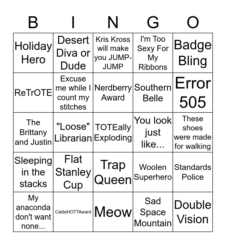 This bingo card has a free space and 24 words: Flat Stanley Cup, CaldeHOTTAward, Nerdberry Award, My anaconda don't want none..., Badge Bling, Holiday Hero, ReTrOTE, Desert Diva or Dude, You look just like..., Trap Queen, Southern Belle, The Brittany and Justin, Woolen Superhero, Standards Police, Excuse me while I count my stitches, Sad Space Mountain, These shoes were made for walking, Kris Kross will make you JUMP-JUMP, Error 505, "Loose" Librarian, Double Vision, Sleeping in the stacks, I'm Too Sexy For My Ribbons and Meow.
