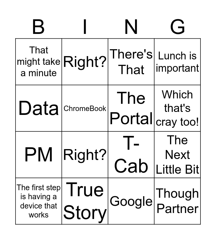 This bingo card has 16 words: True Story, The Next Little Bit, There's That, That might take a minute, PM, Right?, T-Cab, Google, Data, ChromeBook, The first step is having a device that works, Lunch is important, Right?, Which that's cray too!, The Portal and Though Partner.