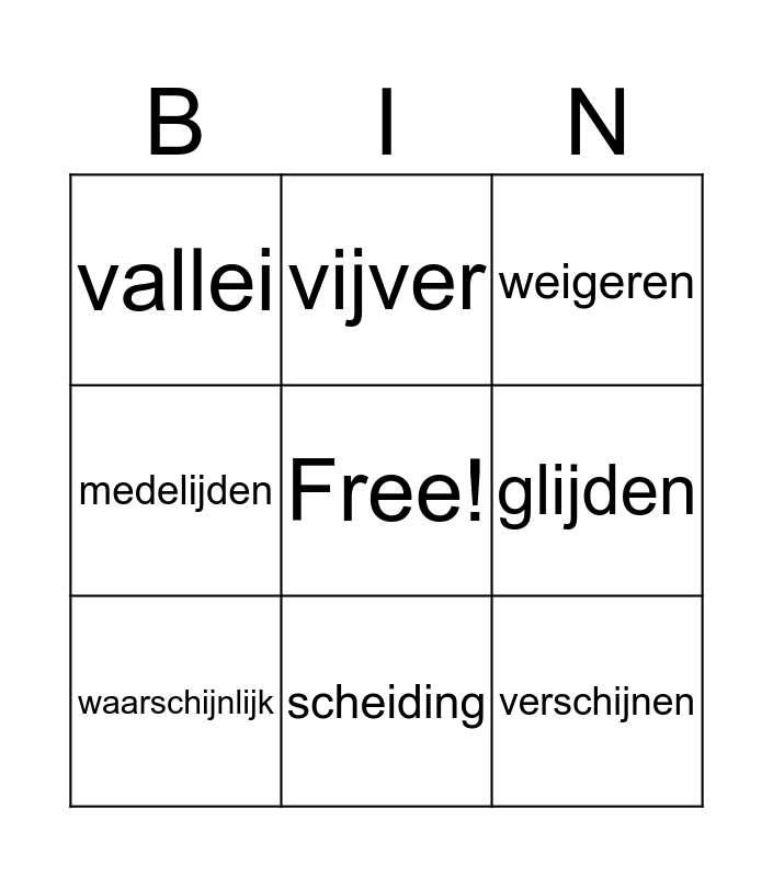 This bingo card has a free space and 17 words: fontein, aardrijkskunde, weigeren, vallei, krijsen, medelijden, schilderij, waarschijnlijk, scheiding, glijden, aardbei, woestijn, verschijnen, vijver, verscheidene, vrij and blij.