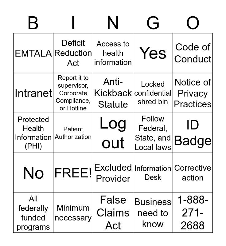This bingo card has 25 words: FREE!, False Claims Act, Anti-Kickback Statute, All federally funded programs, Code of Conduct, EMTALA, Intranet, Deficit Reduction Act, Follow Federal, State, and Local laws, Excluded Provider, Locked confidential shred bin, Protected Health Information (PHI), Information Desk, Corrective action, Report it to supervisor, Corporate Compliance, or Hotline, 1-888-271-2688, ID Badge, Access to health information, Notice of Privacy Practices, Patient Authorization, Log out, Minimum necessary, No, Yes and Business need to know.