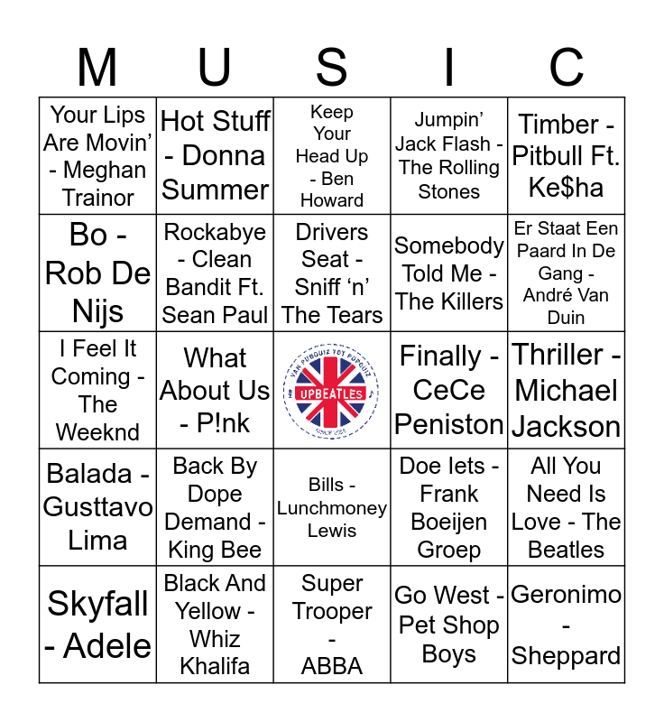 This bingo card has a free space and 24 words: Back By Dope Demand - King Bee, Black And Yellow - Whiz Khalifa, Drivers Seat - Sniff ‘n’ The Tears, Skyfall - Adele, Timber - Pitbull Ft. Ke$ha, Your Lips Are Movin’ - Meghan Trainor, Bo - Rob De Nijs, Hot Stuff - Donna Summer, Finally - CeCe Peniston, Bills - Lunchmoney Lewis, Somebody Told Me - The Killers, I Feel It Coming - The Weeknd, Doe Iets - Frank Boeijen Groep, All You Need Is Love - The Beatles, Rockabye - Clean Bandit Ft. Sean Paul, Go West - Pet Shop Boys, Thriller - Michael Jackson, Keep Your Head Up - Ben Howard, Er Staat Een Paard In De Gang - André Van Duin, What About Us - P!nk, Geronimo - Sheppard, Balada - Gusttavo Lima, Jumpin’ Jack Flash - The Rolling Stones and Super Trooper - ABBA.