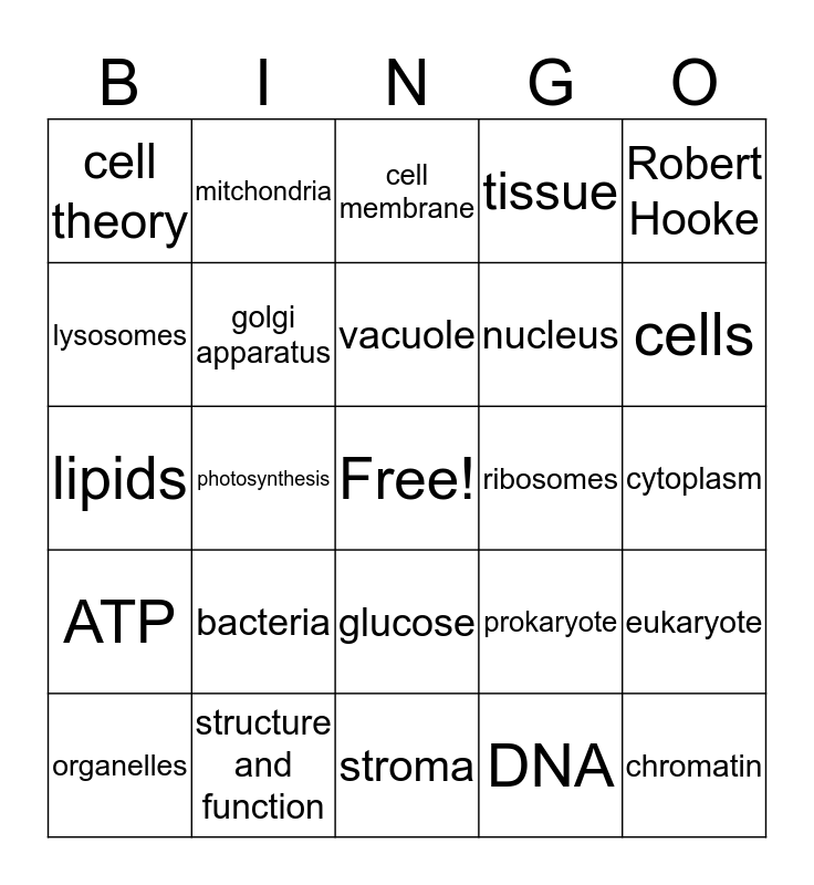 This bingo card has a free space and 24 words: organelles, bacteria, vacuole, DNA, Robert Hooke, cell theory, mitchondria, cell membrane, ribosomes, cytoplasm, lipids, golgi apparatus, prokaryote, eukaryote, lysosomes, structure and function, stroma, tissue, cells, ATP, photosynthesis, glucose, nucleus and chromatin.