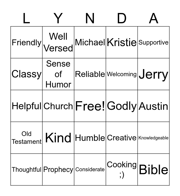 This bingo card has a free space and 25 words: Kind, Considerate, Reliable, Thoughtful, Supportive, Friendly, Classy, Well Versed, Godly, Humble, Welcoming, Helpful, Creative, Knowledgeable, Sense of Humor, Loves to Read, Austin, Michael, Jerry, Church, Bible, Prophecy, Old Testament, Kristie and Cooking ;).