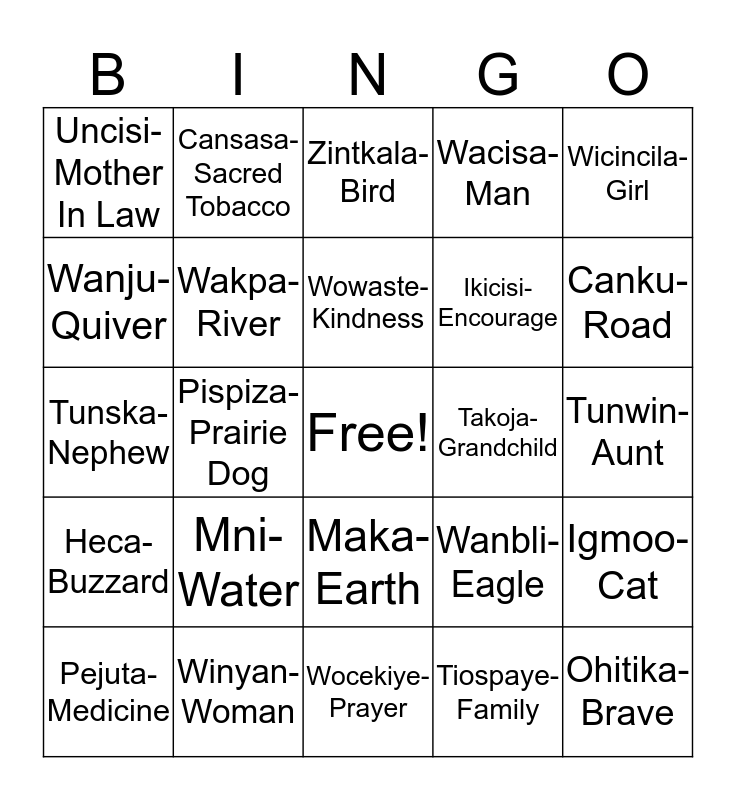 This bingo card has a free space and 43 words: Wa'ste-Good, Ohitika-Brave, Luta-Red, Pejuta-Medicine, Unpan-Elk, Tiospaye-Family, Zintkala-Bird, Hoksila-Boy, Wicincila-Girl, Winyan-Woman, Wacisa-Man, Takoja-Grandchild, Maka-Earth, Mni-Water, Wakan-Holy, Wocekiye-Prayer, Tojan-Niece, Tunska-Nephew, Maza-Iron, Canku-Road, Cansasa-Sacred Tobacco, Unci-Grandma, Gaka-Grandpa, Uncisi-Mother In Law, Cuwe-Big Sister, Tunwin-Aunt, Kola-Friend, Zi-Yellow, Wanbli-Eagle, Heca-Buzzard, Sunka-Dog, Igmoo-Cat, Mato-Bear, Pispiza-Prairie Dog, Kaspapi Okise-Nickle, Kaspapi-Dime, Solkela-Quarter, Wowaste-Kindness, Wanju-Quiver, Ikicisi-Encourage, Pehin-Hair, Wakpa-River and Makoce-Earth.
