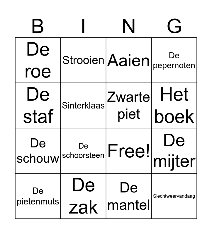 This bingo card has 19 words: Free!, Hinniken, Aaien, Slechtweervandaag, De mijter, De staf, De mantel, De roe, Strooien, De schouw, De schoorsteen, Sinterklaas, Zwarte piet, De zak, De pietenmuts, De stoomboot, De pepernoten, Het boek and Het dak.