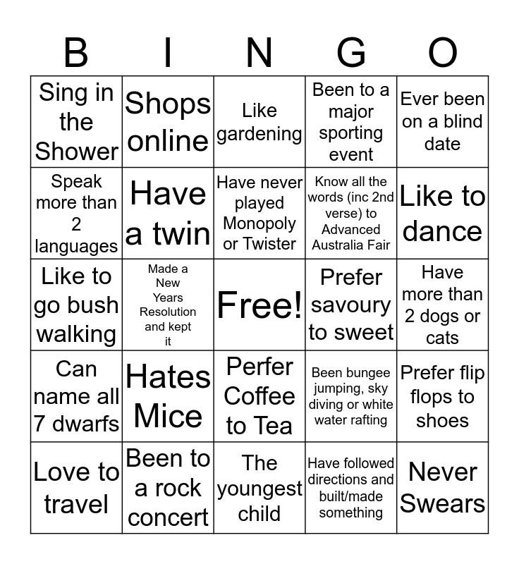 This bingo card has a free space and 44 words: Traveled overseas, Never Swears, Have freckles, Love to travel, Prefer Chocolate to Pizza, Have followed directions and built/made something, Like gardening, Decorate the outside of their house at Christmas, Ever been on a blind date, Been to a rock concert, Been to a major sporting event, Prefer savoury to sweet, Perfer Coffee to Tea, Hates Mice, Like Snakes and reptiles, The youngest child, The eldest Child, Like to go bush walking, Can whistle loudly, Like to dance, Shops online, Have never tried Jamberry, Have a TV show you never miss, Sing in the Shower, Have caught a fish, Have more than 2 dogs or cats, Check facebook daily, Not on Facebook, Been bungee jumping, sky diving or white water rafting, Can name all 7 dwarfs, Good at telling jokes, Prefer flip flops to shoes, Do not drink soft drink, Prefers Wine to Beer or Cider, Made a New Years Resolution and kept it, Enjoys Cooking, Hates Cooking, Loves to read, Have never played Monopoly or Twister, Speak more than 2 languages, Know all the words (inc 2nd verse) to Advanced Australia Fair, Play a musical instrument, Have a twin and Have seen the same movie 5 times or more.