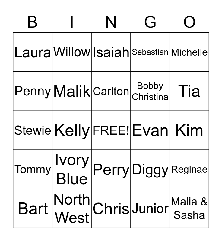 This bingo card has a free space and 24 words: Ivory Blue, North West, Carlton, Bart, Michelle, Laura, Penny, Willow, Evan, Perry, Bobby Christina, Stewie, Diggy, Reginae, Malik, Junior, Kim, Isaiah, Tia, Kelly, Malia & Sasha, Tommy, Sebastian and Chris.