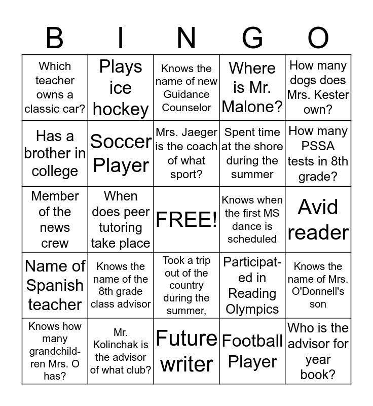 This bingo card has a free space and 24 words: Knows the name of the 8th grade class advisor, Mr. Kolinchak is the advisor of what club?, Mrs. Jaeger is the coach of what sport?, Knows how many grandchild-ren Mrs. O has?, How many dogs does Mrs. Kester own?, Which teacher owns a classic car?, Has a brother in college, Plays ice hockey, Knows when the first MS dance is scheduled, Took a trip out of the country during the summer,, Spent time at the shore during the summer, Member of the news crew, Participat- ed in Reading Olympics, Knows the name of Mrs. O'Donnell's son, Soccer Player, Football Player, Avid reader, Knows the name of new Guidance Counselor, How many PSSA tests in 8th grade?, When does peer tutoring take place, Who is the advisor for year book?, Name of Spanish teacher, Where is Mr. Malone? and Future writer.
