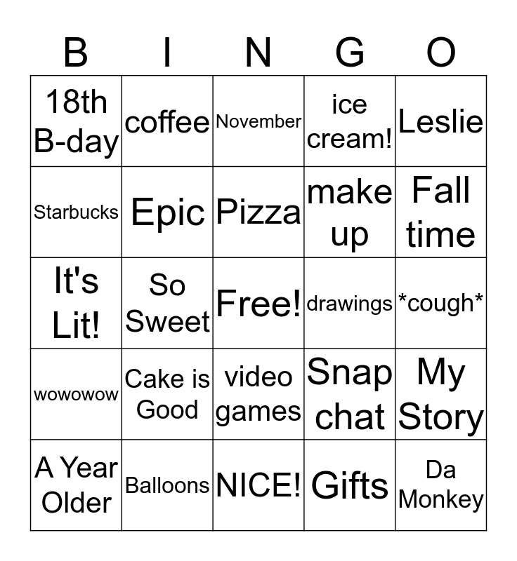 This bingo card has a free space and 24 words: Cake is Good, Balloons, Pizza, A Year Older, Leslie, 18th B-day, Starbucks, coffee, drawings, video games, make up, It's Lit!, Snap chat, My Story, Epic, Gifts, *cough*, November, Fall time, So Sweet, Da Monkey, wowowow, ice cream! and NICE!.