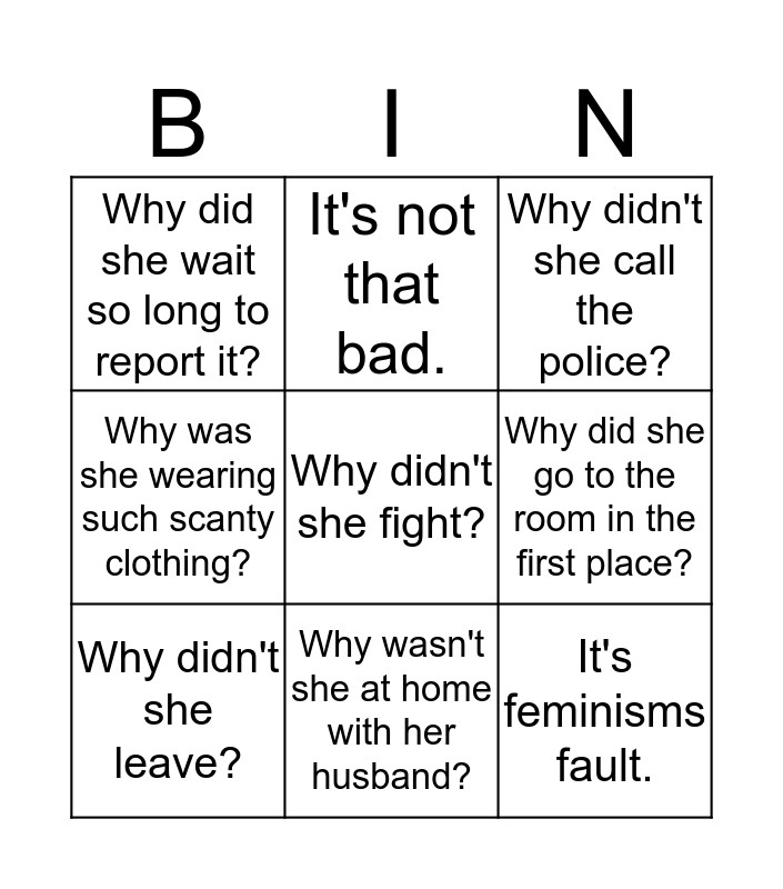 This bingo card has 9 words: Why didn't she leave?, Why didn't she fight?, Why didn't she call the police?, Why did she wait so long to report it?, It's not that bad., Why did she go to the room in the first place?, Why was she wearing such scanty clothing?, Why wasn't she at home with her husband? and It's feminisms fault..