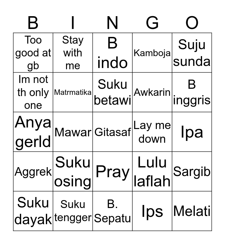 This bingo card has a free space and 24 words: Suku osing, Suku tengger, Suku betawi, Suku dayak, Suju sunda, Too good at gb, Im not th only one, Stay with me, Lay me down, Pray, Awkarin, Anya gerld, Lulu laflah, Sargib, Matrmatika, Ips, Ipa, B indo, B inggris, Mawar, Melati, Aggrek, Kamboja and B. Sepatu.