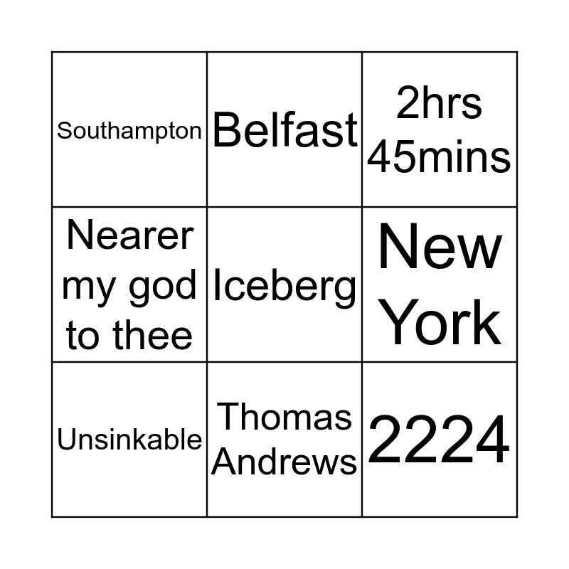 This bingo card has 25 words: RMS Titanic, Captain Smith, Thomas Andrews, Joseph Ismay, Iceberg, Southampton, New York, Belfast, White Star Line, April 15th, 2224, SOS, Grand Staircase, Molly Brown, Unsinkable, 20 Lifeboats, SS Californian, 2hrs 45mins, 705, 1500, RMS Carpathia, First Class, Steerage, Nearer my god to thee and Grand Staircase.