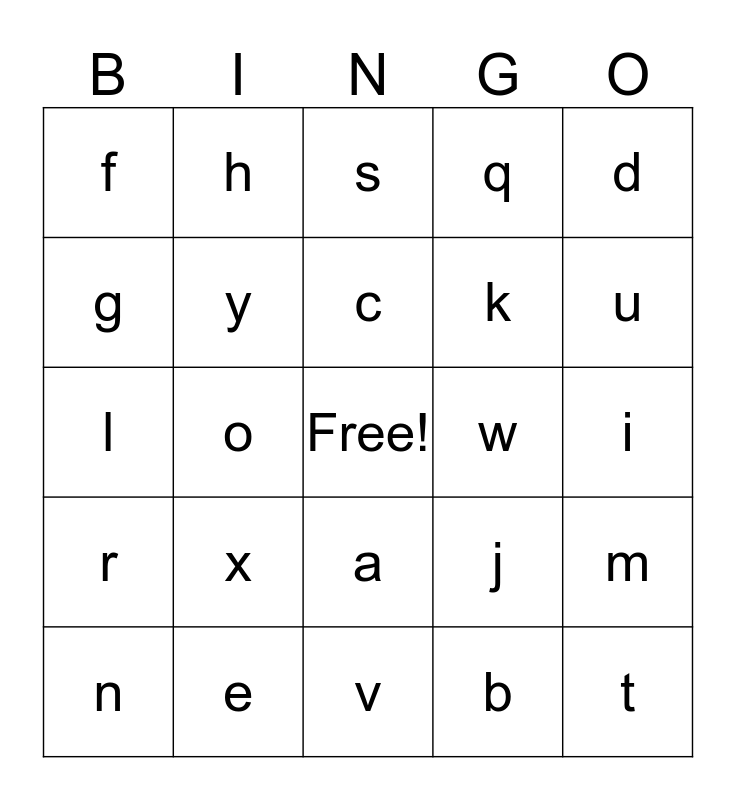 This bingo card has a free space and 26 words: a, b, c, e, d, f, g, h, i, j, k, l, m, n, o, p, q, r, s, t, u, v, w, x, y and z.